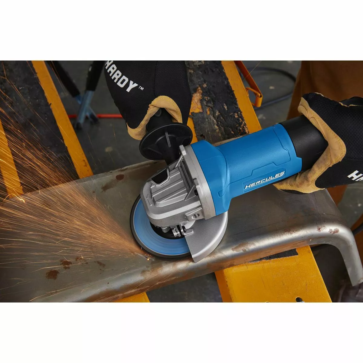 The HERCULES® 4-1/2 in. 11 Amp Angle Grinder is designed for professional use. The all-metal gearbox and ball bearing motor deliver professional performance in heavy applications. The paddle switch with lock-on provides control in confined spaces. This grinder is optimized for grinding, cutting, shaping and other material removal.