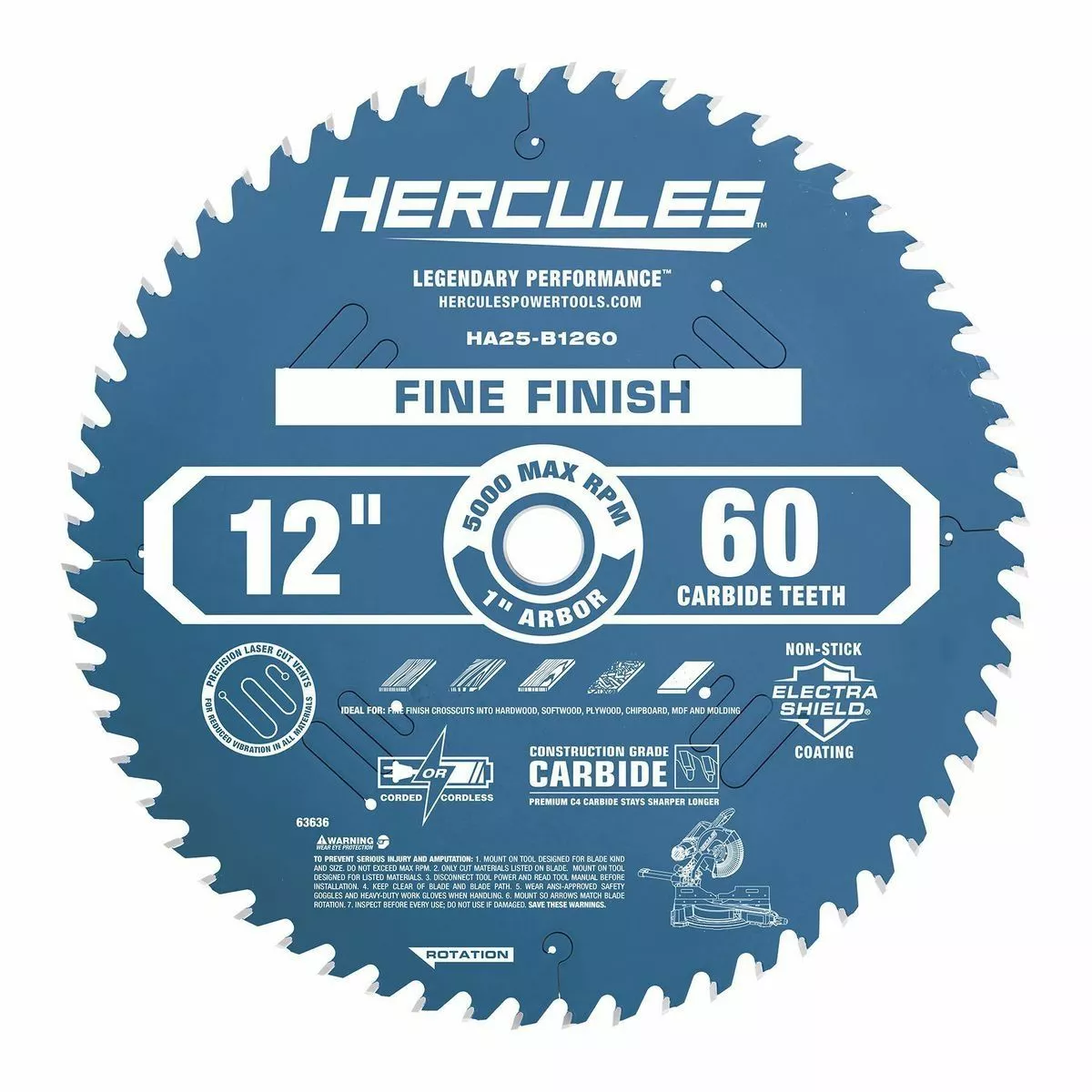The HERCULES™ 12 in. , 60T Fine Finish Miter Saw Blade delivers exceptional performance with full-blade Electra Shield™ non-stick coating to prevent burning, sticking and gumming. The HERCULES™ table saw blade is constructed with premium tungsten carbide cutting teeth, deeper gullets and anti-kickback design for long lasting performance.