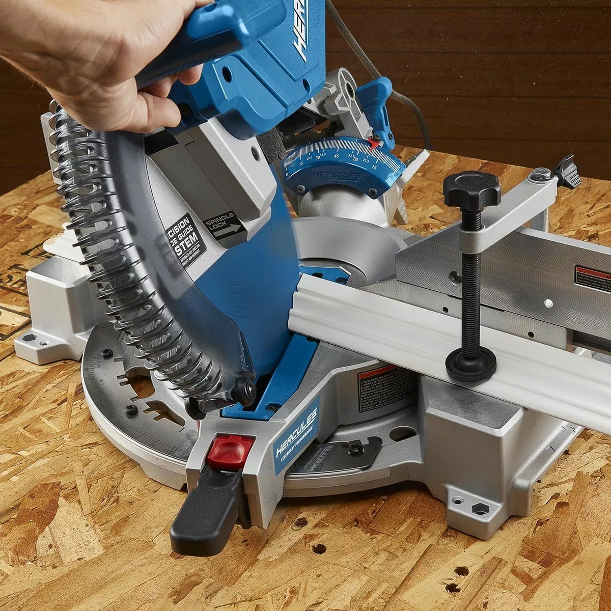 The HERCULES® Professional 12 in. Dual Bevel Compound Miter Saw is designed with a Precision Blade Guide System that uses an LED light shadow for improved visibility resulting in a more accurate cut. The high output 15 AMP, 4100 RPM motor delivers increased power for high performance cutting. Tall sliding fences support crown molding up to 6-5/8 in. (vertically nested) and baseboard up to 6-1/2 in. (vertically against the fence). Includes HERCULES® Ultra Sharp, Long Lasting 12 in. x 60 tooth carbide-tipped saw blade for fast, fine cutting.