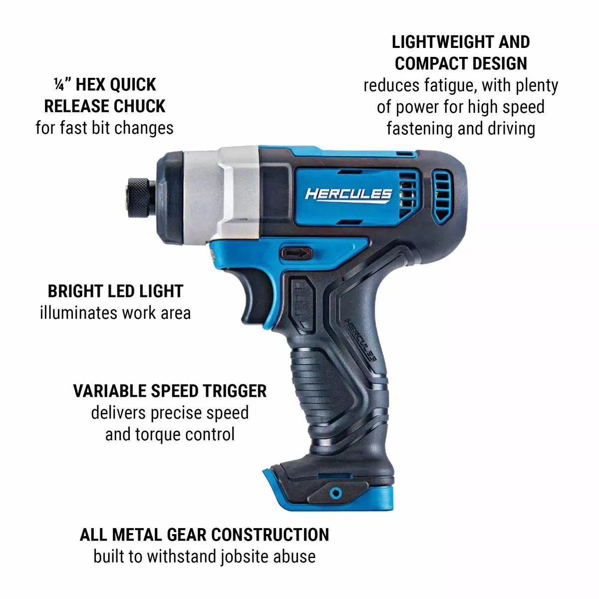 The 12V HERCULES® cordless compact 1/4 in. hex impact driver puts out 1000 in. lbs. of torque and 3030 IPM to handle a wide range of fastening applications including work on decking, fencing, or drywall. A built-in LED light with delay after trigger release gives you a clear view in dark spaces. Combined with the HERCULES® Lithium-Ion battery system for fast charging and longer run times this tool deliver legendary performance. Buy with confidence with an included no-questions-asked risk-free trial, with additional coverage up to 2 years.