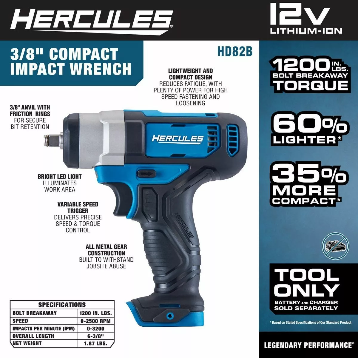 The 12V HERCULES® compact 3/8 in. impact wrench delivers 1200 in. lbs. of bolt breakaway torque at speeds of 0-2500 RPM to power-off nuts and bolts FAST. A built-in LED light with delay after trigger release gives a clear view in dark spaces. The compact, lightweight design makes this impact wrench easy to use for all kinds of installation and removal work. Pair up with the HERCULES® 2.0 Amp Hour battery pack to deliver more work per charge and more work over the life of the pack. Buy with confidence with an included no-questions-asked risk-free trial, with additional coverage up to 2 years.