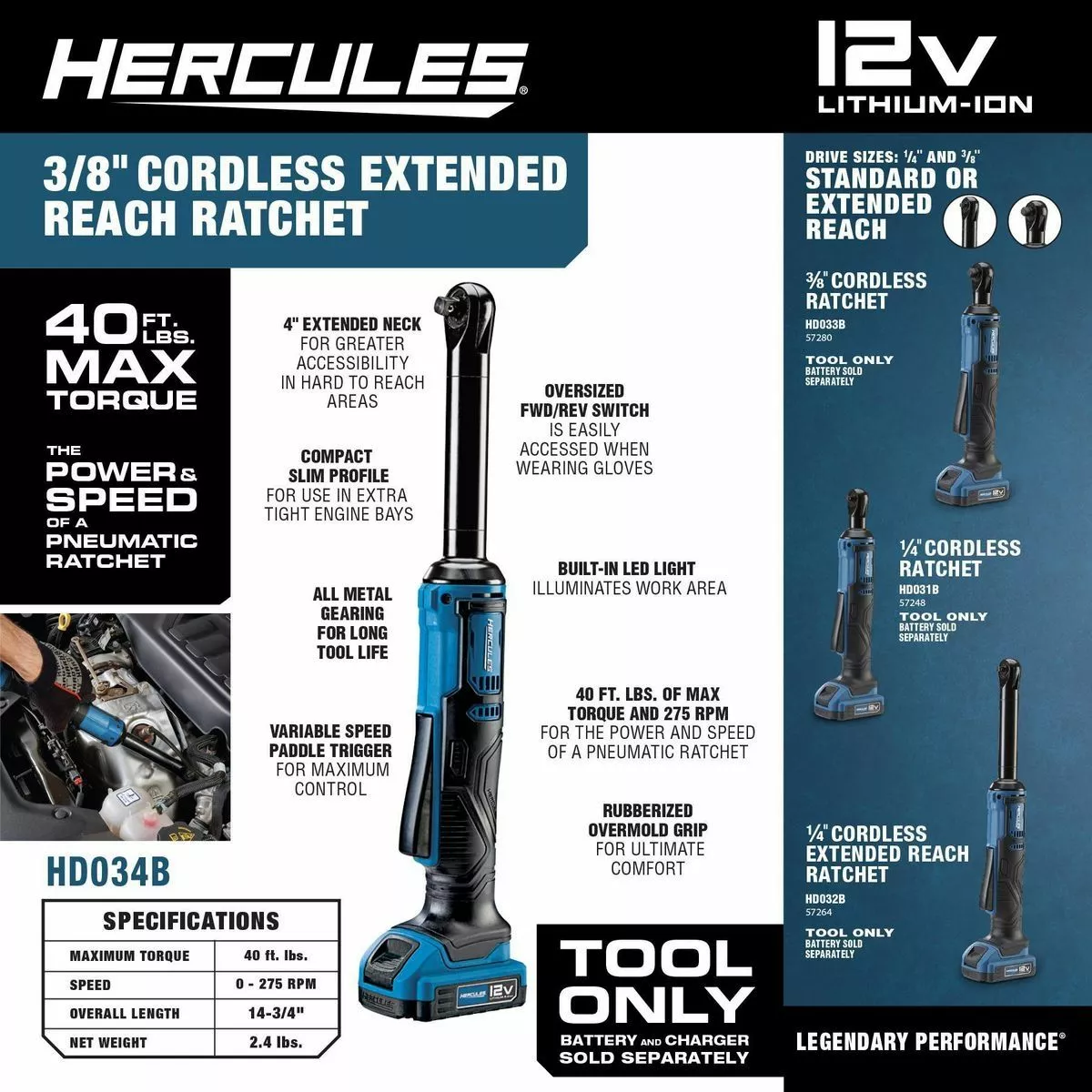 The HERCULES™ 12V Cordless 3/8 in. Extended Reach Ratchet delivers the power and speed of a pneumatic ratchet. The high power motor delivers 40 ft. lbs. of max torque at speeds of 275 RPM to remove the most stubborn fasteners. The compact, slim profile makes this ratchet wrench ideal for using in extra tight engine bays. Pair up with the HERCULES™ 2.0 Amp Hour battery pack to deliver more work per charge and more work over the life of the pack. Buy with confidence, with an included no-questions-asked risk-free trial, extendable for up to 2 years.