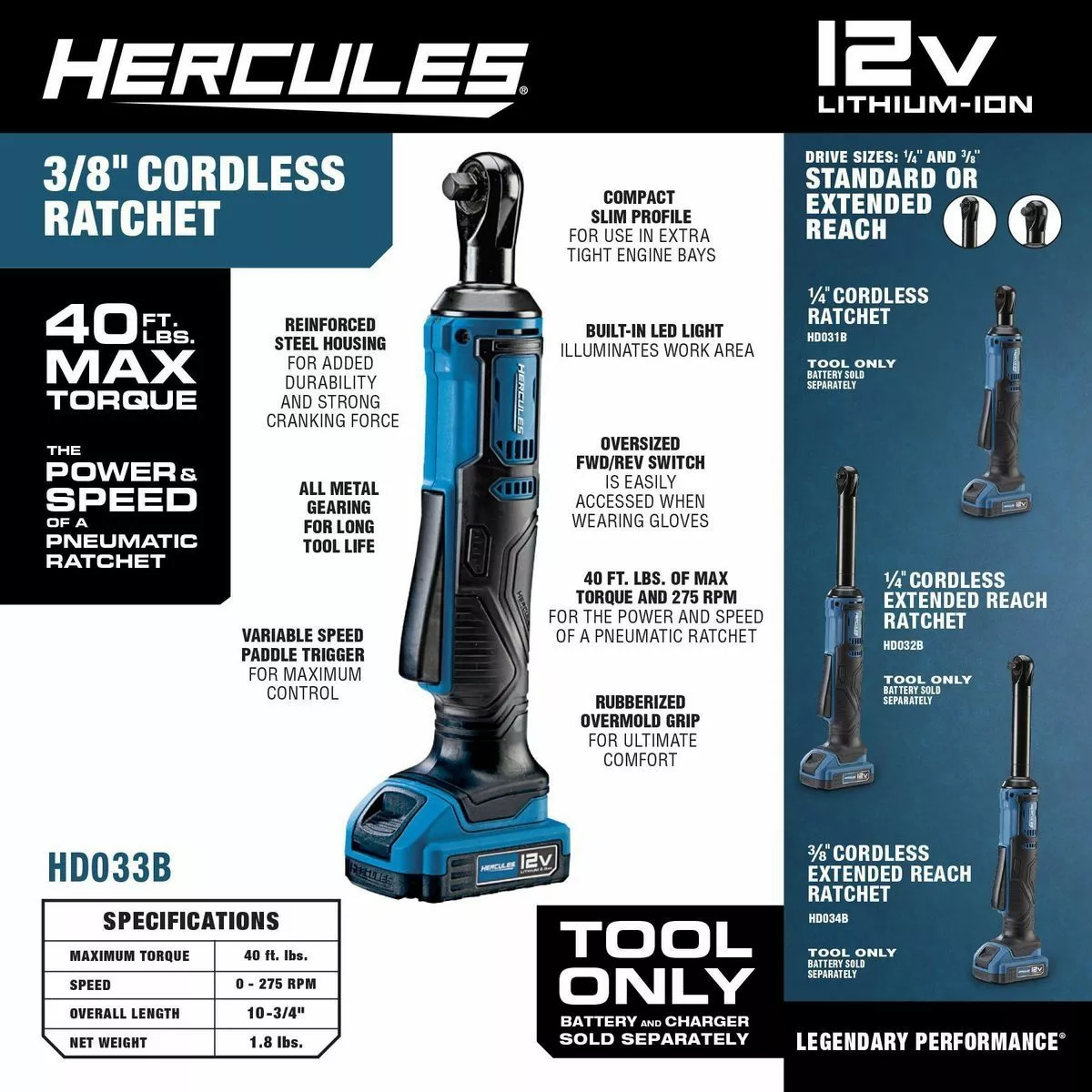 The HERCULES™ 12V Cordless 3/8 in. Ratchet delivers the power and speed of a pneumatic ratchet. The high power motor delivers 40 ft. lbs. of max torque at speeds of 275 RPM to remove the most stubborn fasteners. Pair up with the HERCULES™ 2.0 Amp Hour battery pack to deliver more work per charge and more work over the life of the pack. Buy with confidence, with an included no-questions-asked risk-free trial, extendable for up to 2 years.