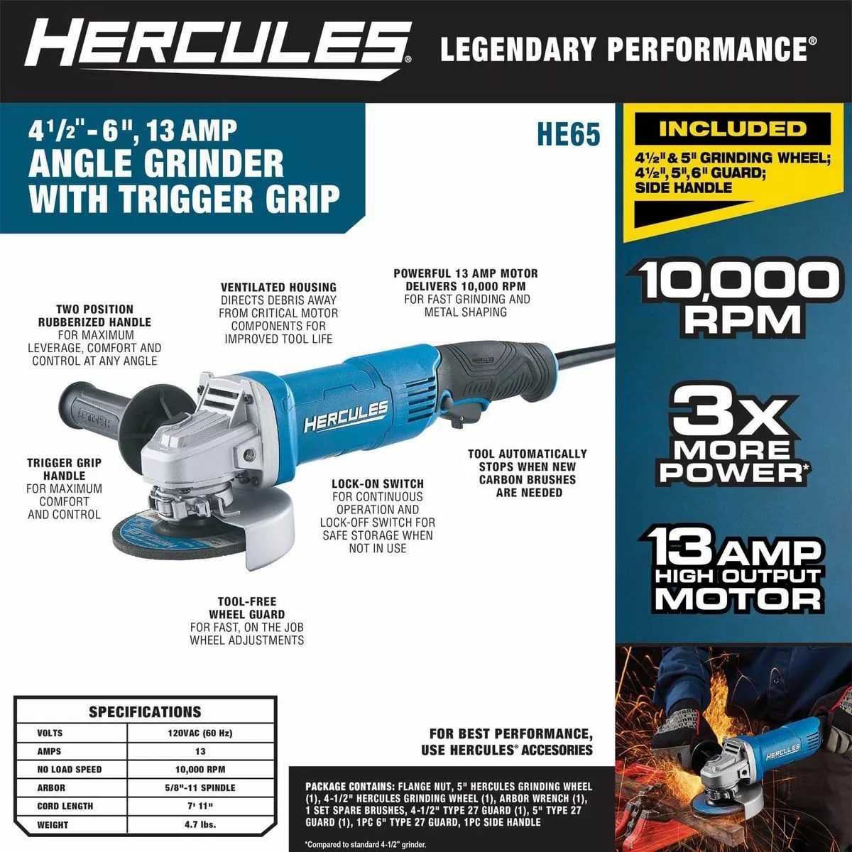 The HERCULES® multi-size grinder with 13 amp motor is designed for professional use. The high-performance motor delivers consistent speeds under loads so it won’t bog down during tough jobs. The grinder includes guards for 4-1/2 in, 5 in. and 6 in. wheels to handle the most demanding applications. The all-metal gear case and rugged impact resistant housing is built to withstand harsh environments and minimize vibration. This grinder is optimized for grinding, cutting, shaping and other heavy duty material removal.