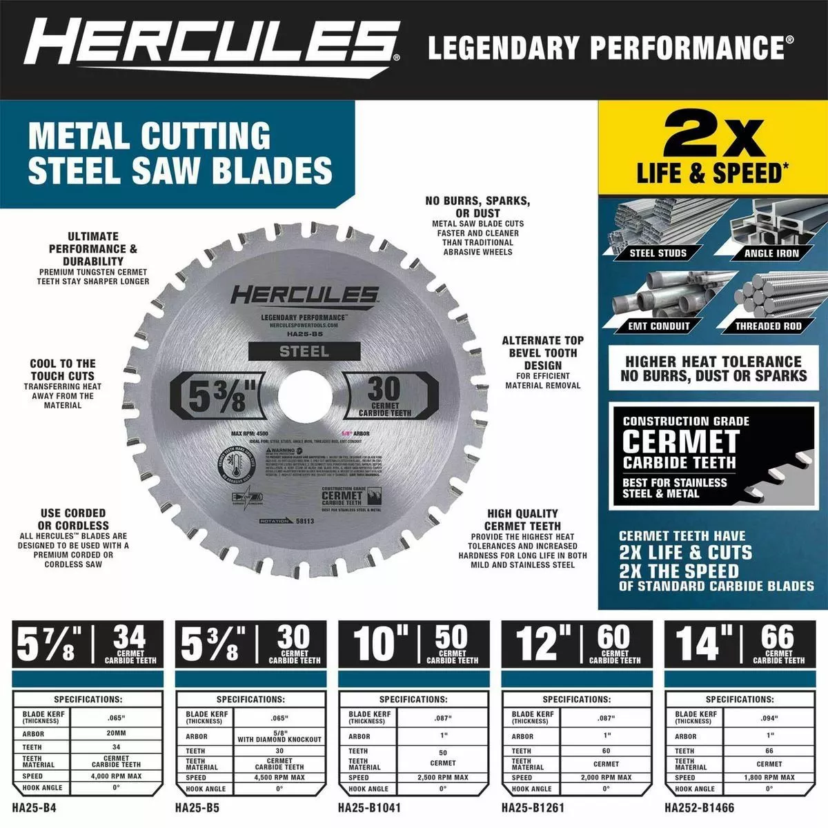 This HERCULES™ 14 in., 66T Cermet Carbide Circular Saw Blade is specially engineered for cutting steel studs, angle iron, threaded rod, EMT conduit. Construction grade cermet carbide teeth deliver the best performance for cutting stainless steel and metal.