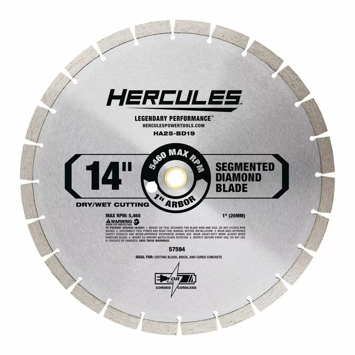 This HERCULES™ 14 in. Segmented Diamond Blade is ideal for cutting through the hardest materials including cured concrete, concrete wirebar, brick, block, paver, and stone. The blade is designed for clean, fast cuts with gas power, electric power, and walk-behind saws. The high grade diamond grit and metal bond matrix ensures faster cuts and longer blade life. The blade is ideal for Wet or Dry application.