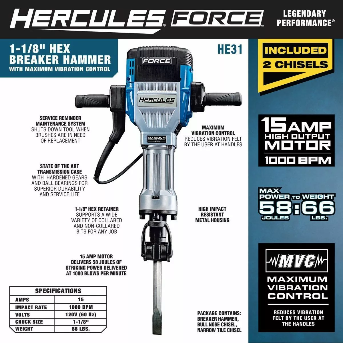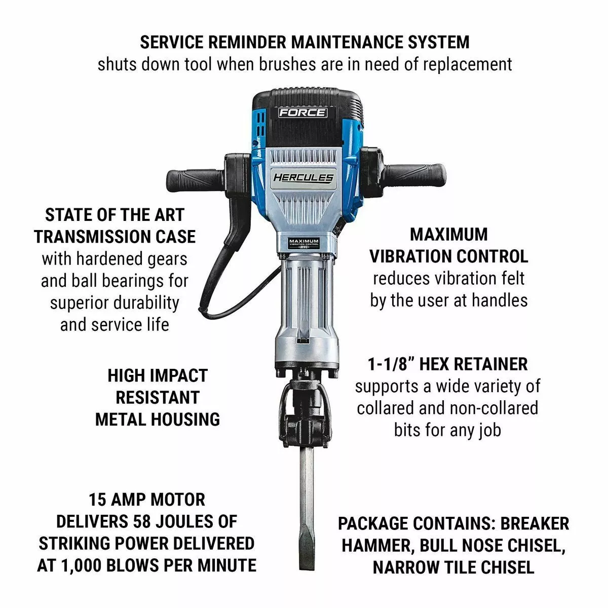 Tackle the toughest jobs with the HERCULES® Force 1-1/8 in. Hex Breaker Hammer. This breaker hammer is built to last, with a super-strong transmission and a hardened gear set. Concrete is no match for the powerful 58 Joules of striking power delivered at an impressive 1000 BPM. This powerful breaker hammer has a universal 1-1/8 in. hex retainer that can be used with collared or non-collared bits to maximize performance. Anti-vibration technology delivers hours of hard use with minimal fatigue. Buy with confidence with an included no-questions-asked risk-free trial, with additional coverage up to 2 years.