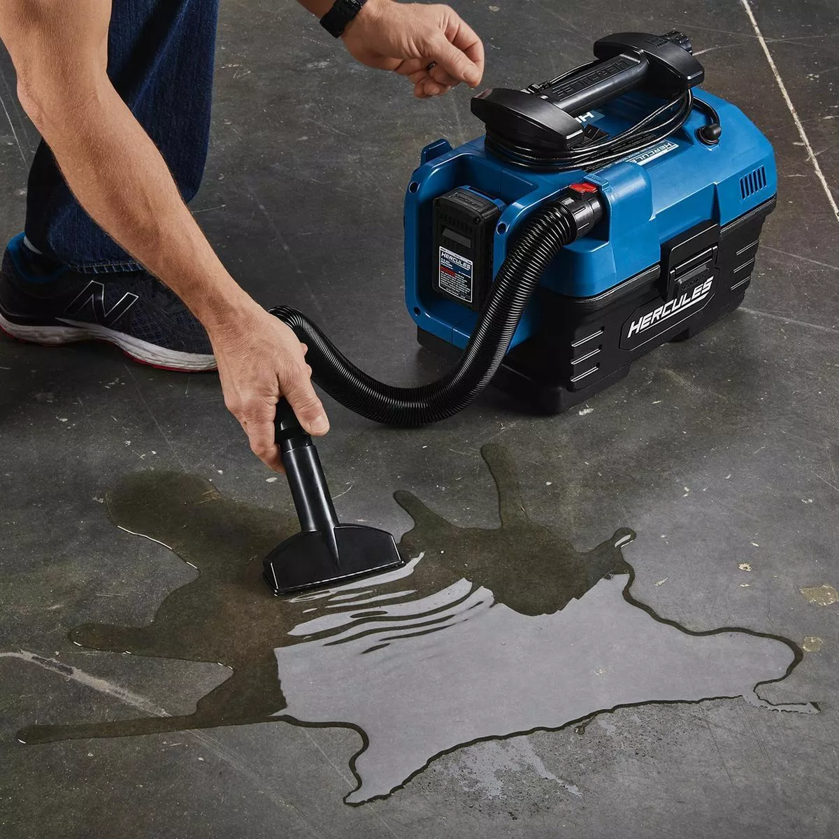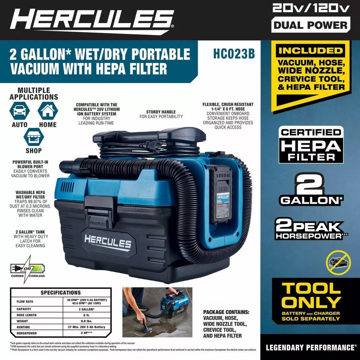 The HERCULES™ 20V/120V Dual Power 2 Gallon Wet/Dry Portable Vacuum is easy to handle for fast cleanup of dust, dirt and debris. Get ultimate portability along with full power and long run times using the HERCULES™ Lithium battery system or switch to 120V for prolonged use. This vacuum has a HEPA wet/dry filter that traps 99.97% of dust at 1 micron and easily washes clean with water. A blower port makes it easy to use the vacuum as a blower to sweep away loose dust and debris. Combined with the HERCULES™ Lithium battery system for fast charging and longer run times, this tool delivers legendary performance that professionals demand.