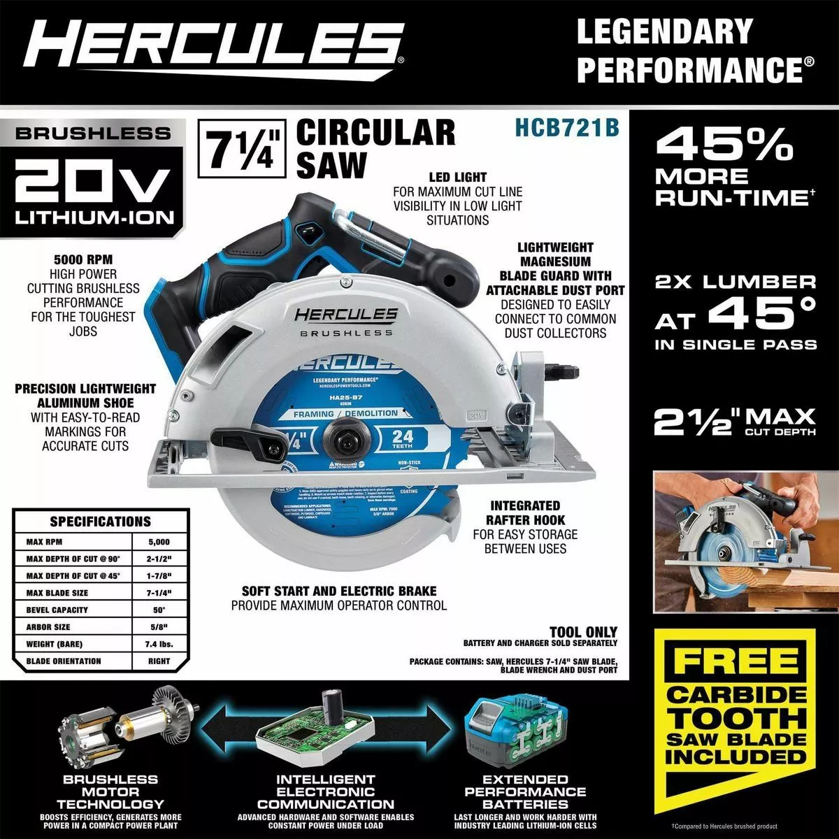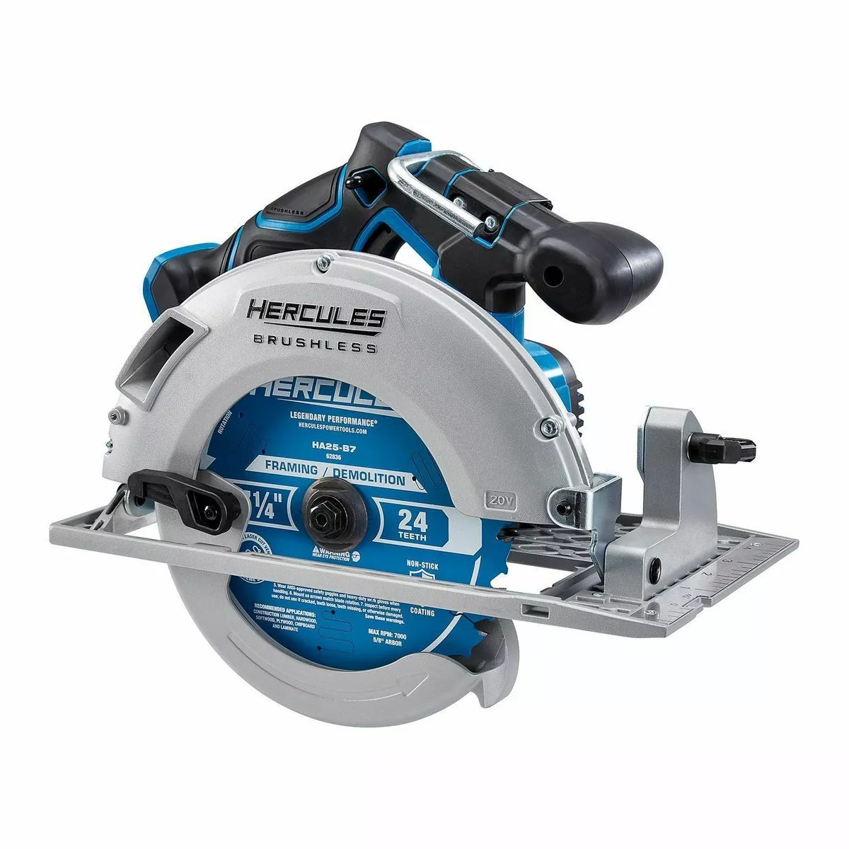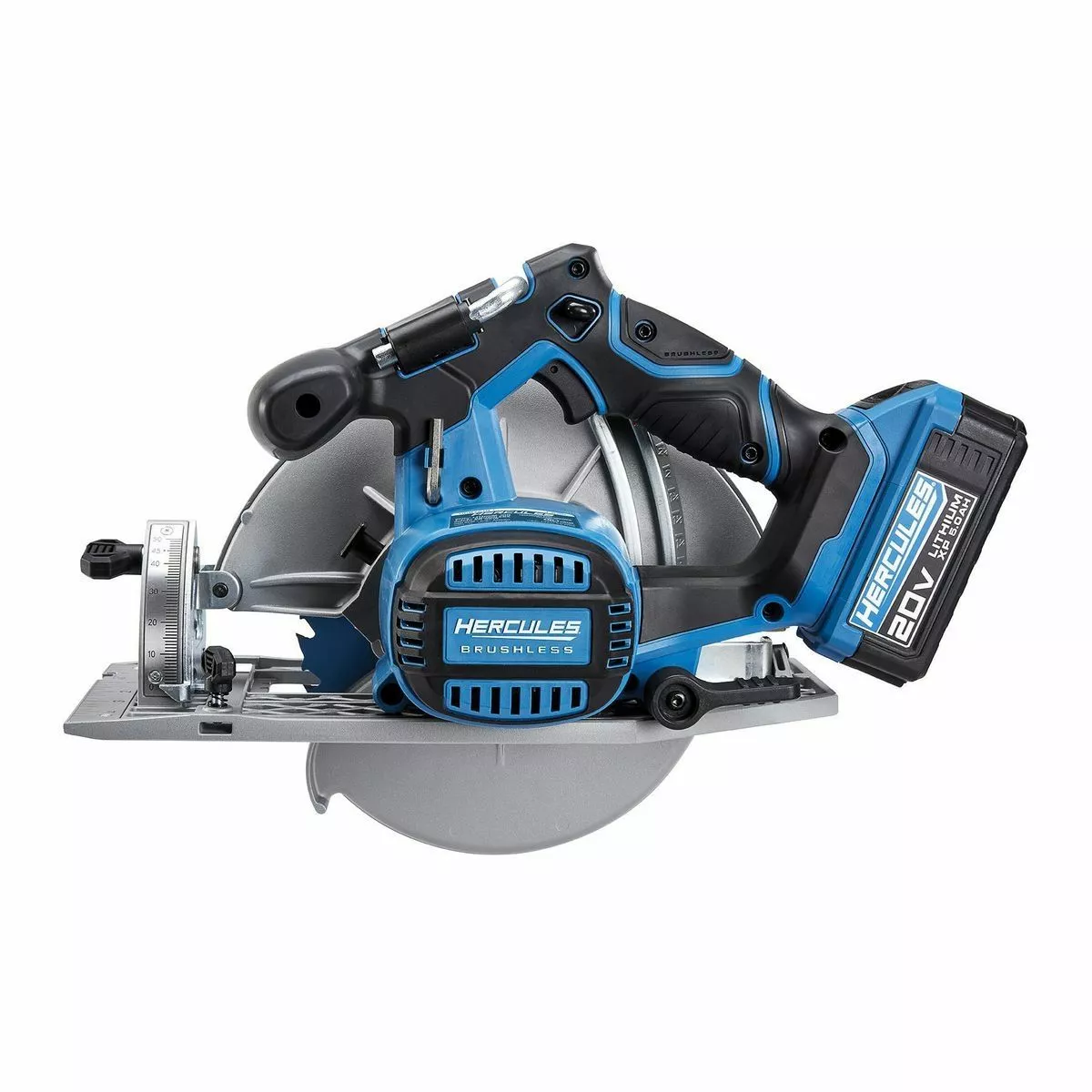 The HERCULES® 20v Brushless Cordless 7-1/4 in. Circular Saw features an advanced brushless motor for up to 45% more run-time*. With 2-1/2 in. max cutting depth this saw handles a wide variety of framing jobs. The sturdy magnesium footplate has a precision scale for accurate bevel cuts from 0-50°. The integrated rafter hook makes it easy to store the tool between jobs. Combined with the HERCULES® lithium battery system for fast charging and longer run times, this tool delivers legendary performance that professionals demand.