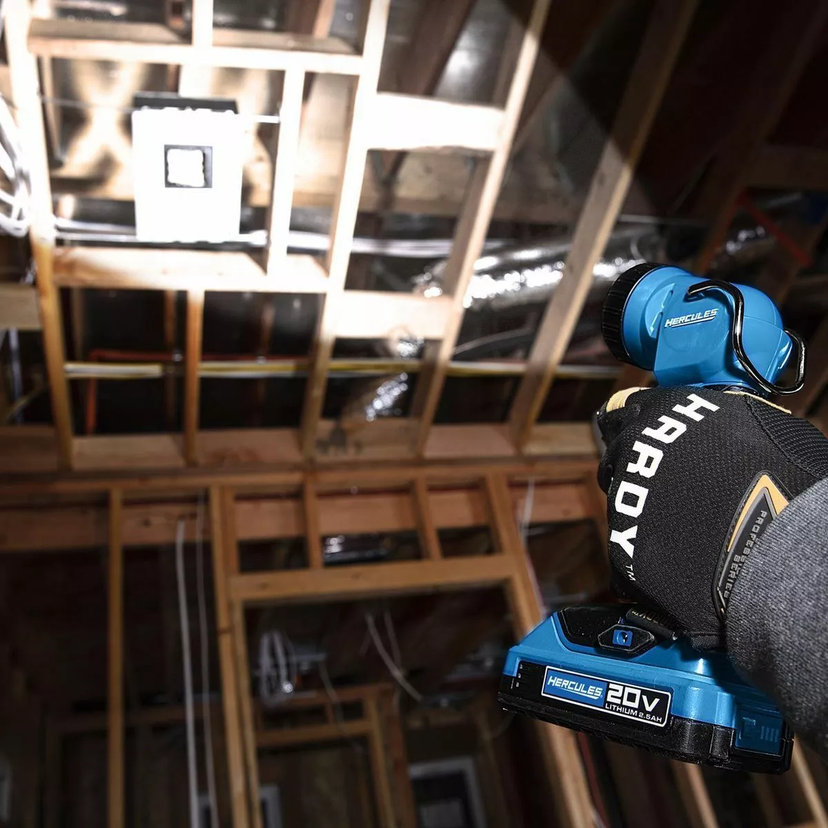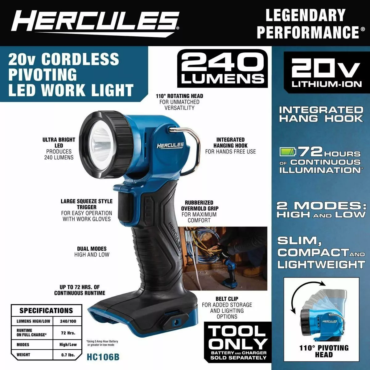 The HERCULES™ 20V Cordless 220 Lumen Work Light is a sturdy, portable light source that works with the HERCULES™ 20V battery system. This versatile work light has a 110° pivoting head for perfect light placement. The light works in two modes, high and low. Using the 5.0Ah HERCULES™ battery, this work light delivers up to 72 hours of continuous light. An integrated hang hook allows this light to be easily positioned. Powered by the HERCULES™ 20v Lithium Ion Battery Platform, battery and charger sold separately.