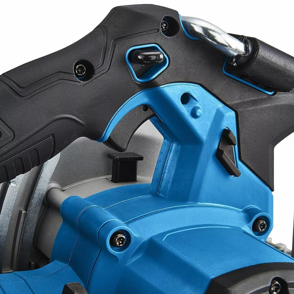 - Blade guard with attachable dust port designed to easily connect to common dust collectors