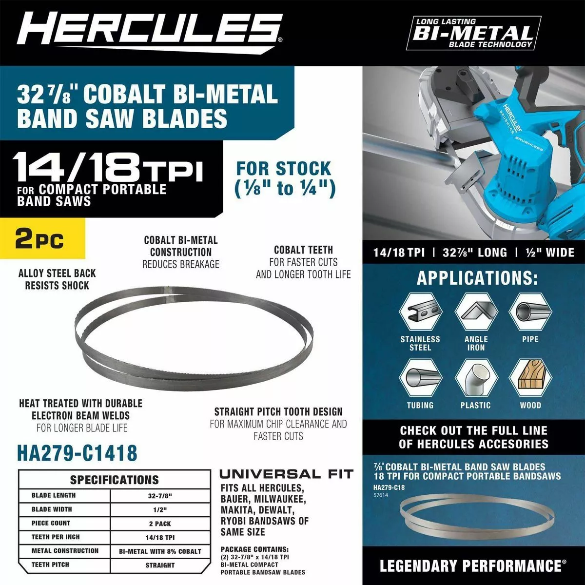 HERCULES™ premium Cobalt Bi-Metal Deep Cut Portable Band Saw Blades are infused with cobalt for faster cuts and longer life. These blades are electron beam welded and heat treated to stay hard, sharp, and flexible for high speed cuts. The universal fit works with all HERCULES, BAUER, MILWAUKEE, MAKITA, DEWALT, and RYOBI band saws of the same size.