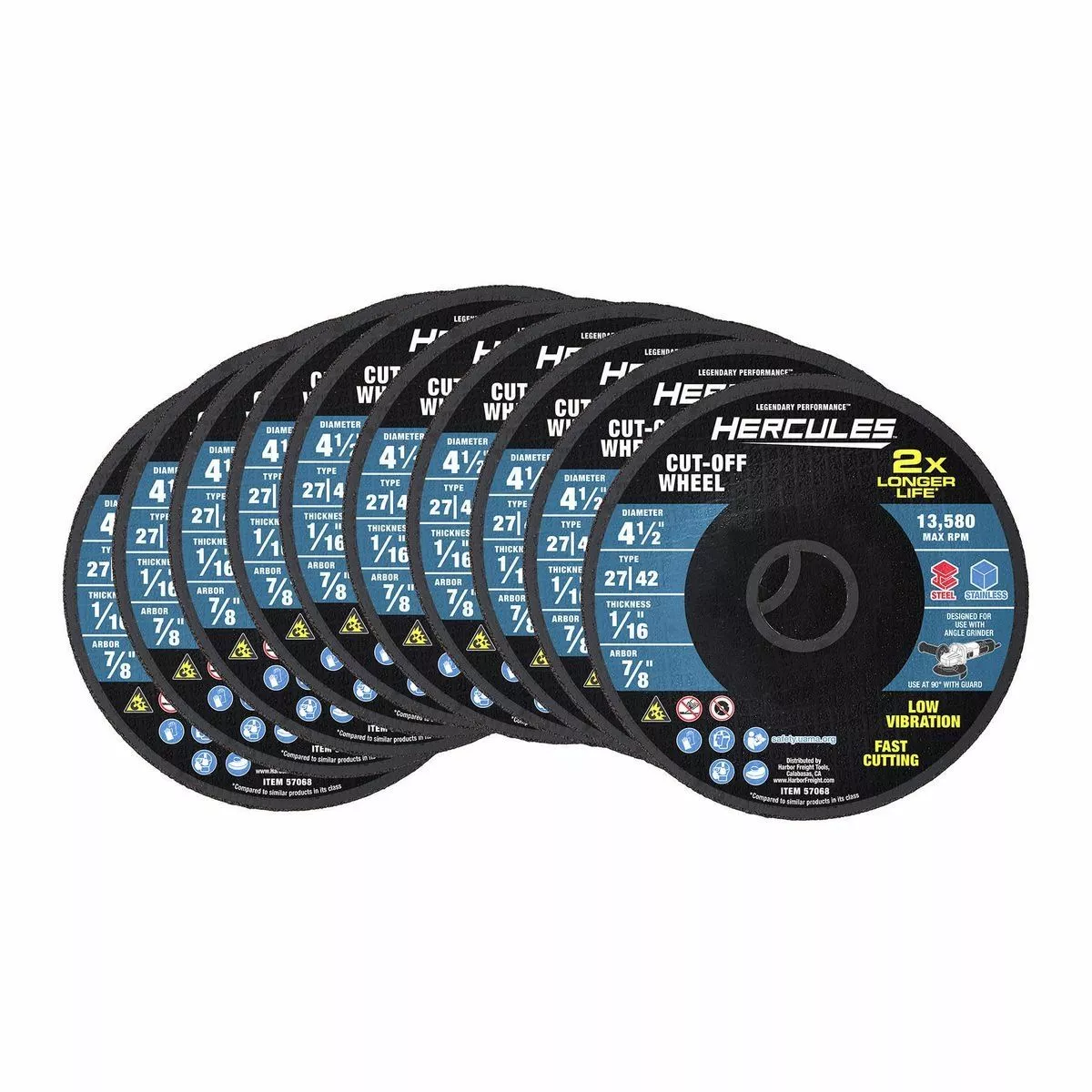 HERCULES™ cut-off wheels are constructed with premium abrasive grains and a high quality resin bond that delivers up to 2X longer life*. Ideal for use with a wide variety of metalworking cutting applications, these cut-off wheels are designed to deliver super fast, clean cuts. Designed for use with angle grinders using the proper safety guard.