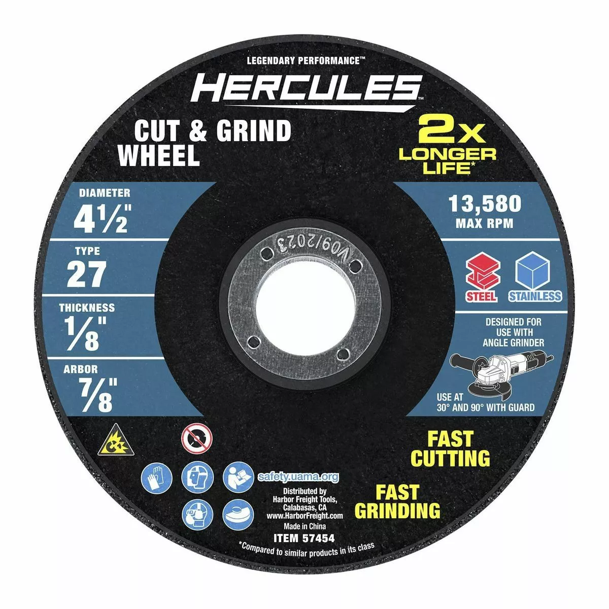 The HERCULES™ 4-1/2 in. Cut and Grind Wheel is superior in durability and performance. Ideal for use with a wide variety of metal grinding applications, this wheel uses premium quality abrasive for the toughest applications. Get the best results when cutting, grinding, smoothing, shaping metal, and removing weld slag.
