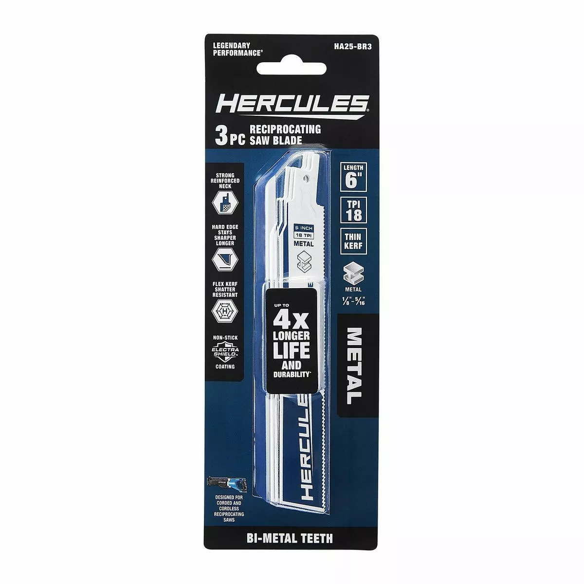 Extra-tough HERCULES™ bi-metal reciprocating saw blades deliver up to 4x longer life and durability*. This pack of reciprocating saw blades is designed for heavy duty metal cutting.