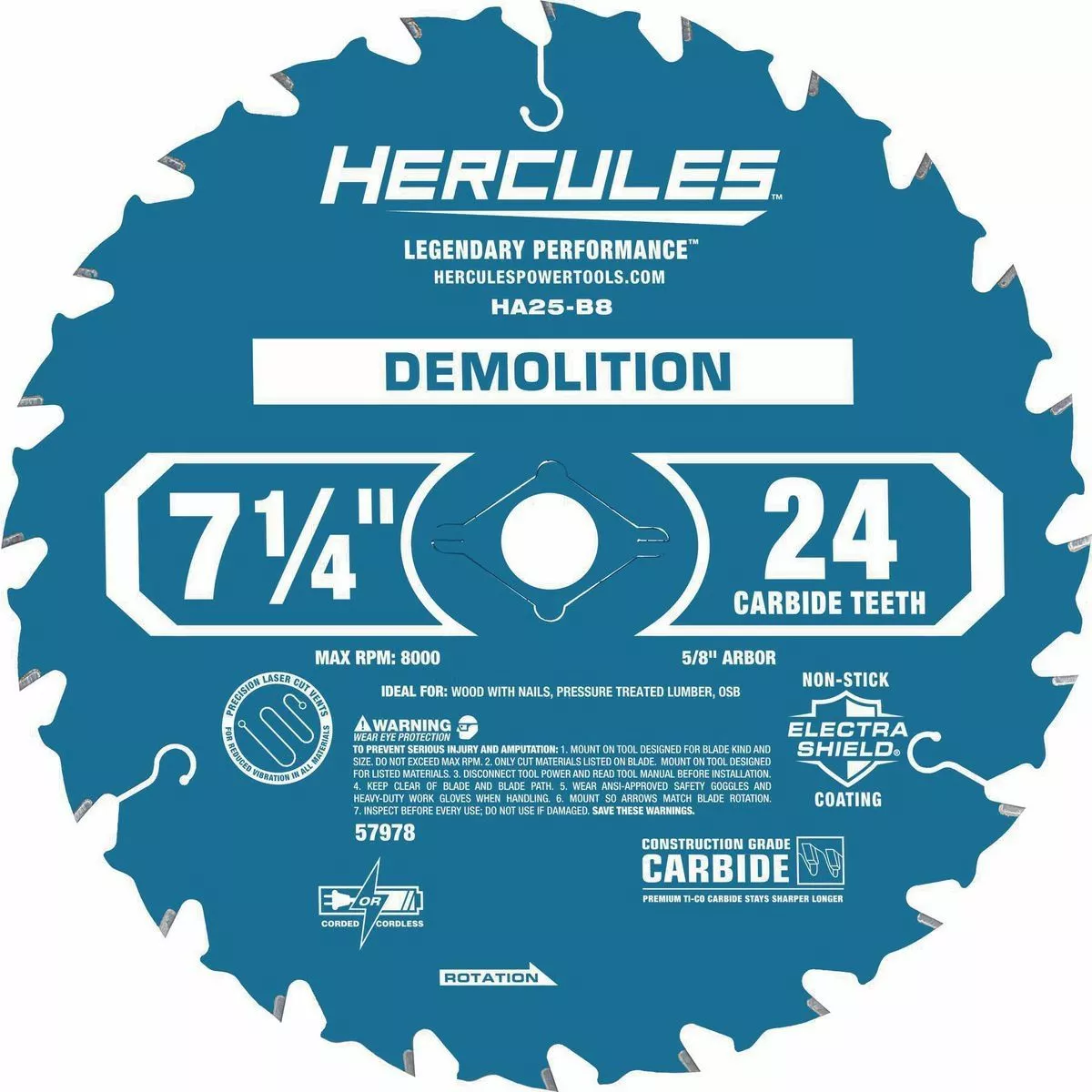 The HERCULES™ 7-1/4 in., 24T Demolition Miter and Circular Saw Blade delivers exceptional performance with full-blade Electra Shield® non-stick coating to prevent burning, sticking and gumming. The HERCULES™ circular saw blade is constructed with premium titanium-cobalt carbide cutting teeth, deeper gullets and anti-kickback design for long lasting performance.