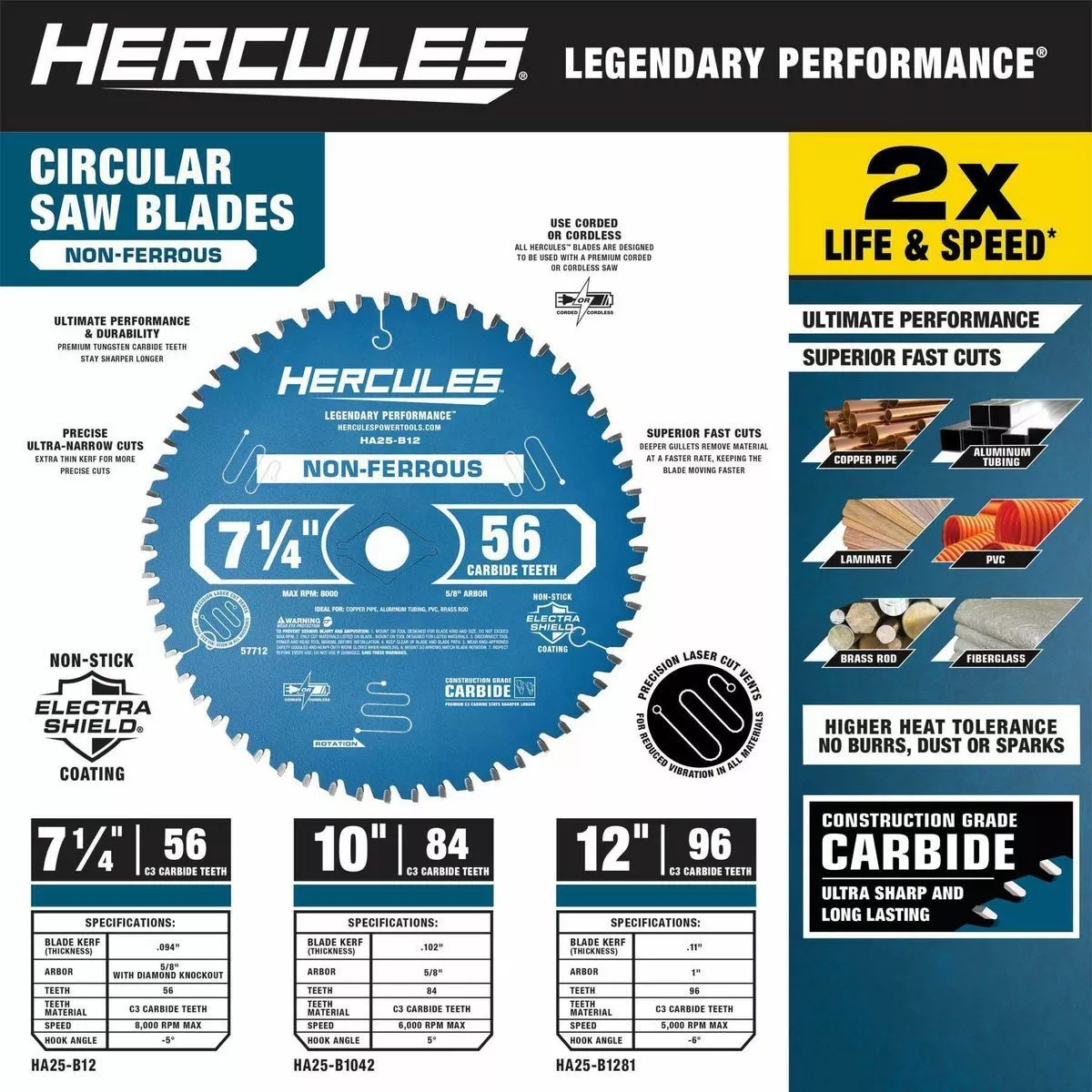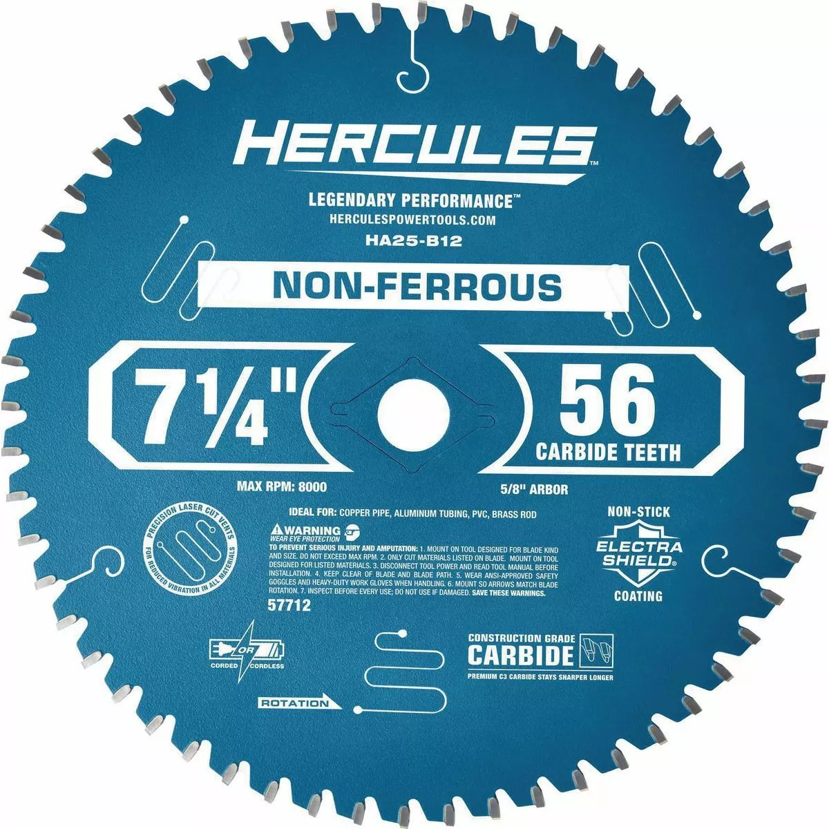 This HERCULES™ 7-1/4 in., 56T Non-Ferrous Circular Blade is specially engineered for cutting copper, aluminum, brass, fiberglass, PVC, and laminate. Precision laser-cut vents reduce vibration for smoother, more accurate cutting. The non-stick Electra-Shield® coating prevents sticking, gumming and burning.