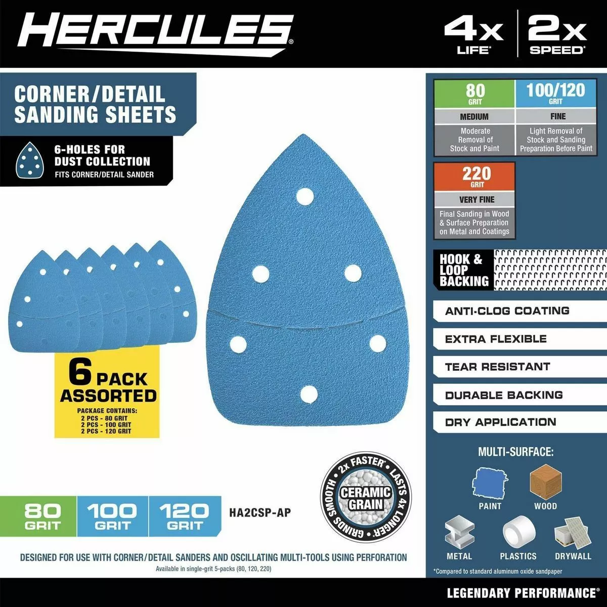 HERCULES™ Professional Corner/Detail Sanding Sheets feature an extra flexible design, durable backing, and tear resistant construction to work 2X faster*, last 4X longer*. These sanding sheets are designed for light removal of stock and sanding preparation before paint. The Premium ceramic alumina grain is ideal for multiple materials including moderate removal of stock and paint and light removal of stock and preparation before paint.