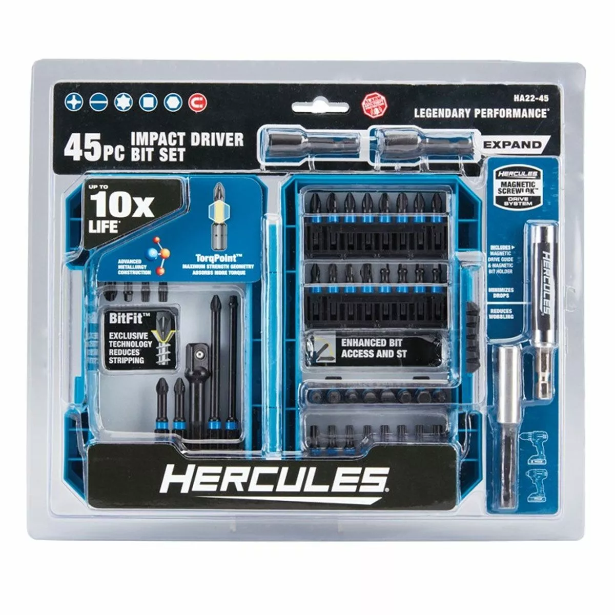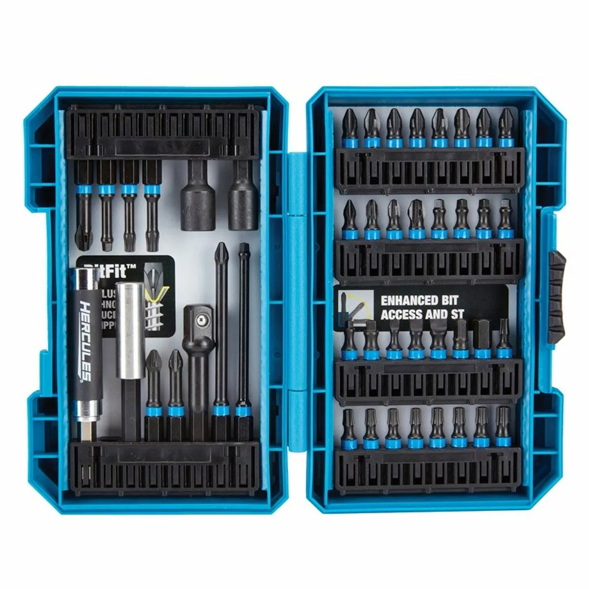Extremely tough alloys and advanced design make these Hercules impact bits outlast the others. Packed in a jobsite-tough case with easy-access bit storage, these drivers are capable of driving over 1500 screws before showing signs of wear – up to 10x life! This insert bit set comes with the Hercules magnetic drive guide and bit holder for fast bit changes without dropping or wobbling. Exclusive BitFit™ design gives you the best fit in fasteners to reduce stripping. Advanced TorqPoint™ design for max shock absorbing, making these the preferred bits for use with Hercules drill/drivers and impact drivers.